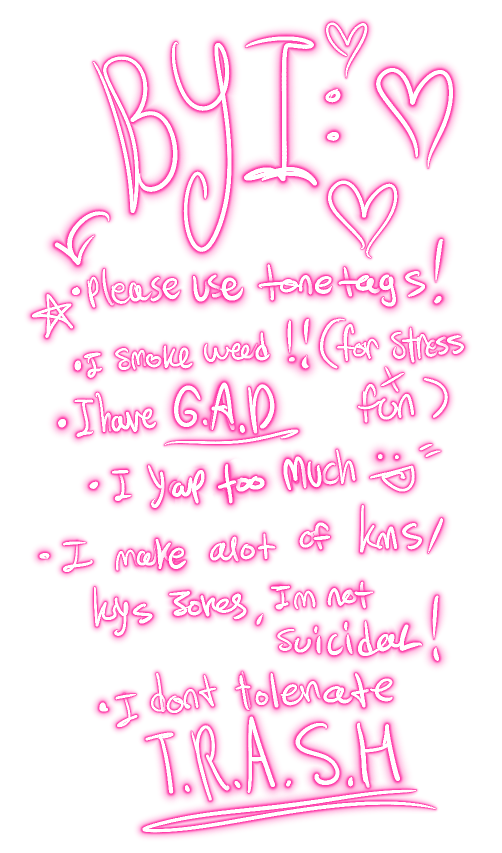 2) DNI::: SHOTAS AND LOLICONS!!!!!, a proshipper, someone who fakes disorders/disabilities, whitewash, will try to flirt with me, racist, ableist, homophobic, are too aggressive(i have trauma relating to it), will judge me for stimming or acting "funny", call me a slur as a way to dehumanize me, like "your boyfriend", have a porn addiction. disrespect disorders or disabilities and age regression, are very toxic, have a bad rep of toxicity, WERE my friend but I stopped talking to you,a dream Stan or dreamsexuals, disrespect my interests/music taste(like the content not the creator), fake TT, and ask me my other DNI bc I forget